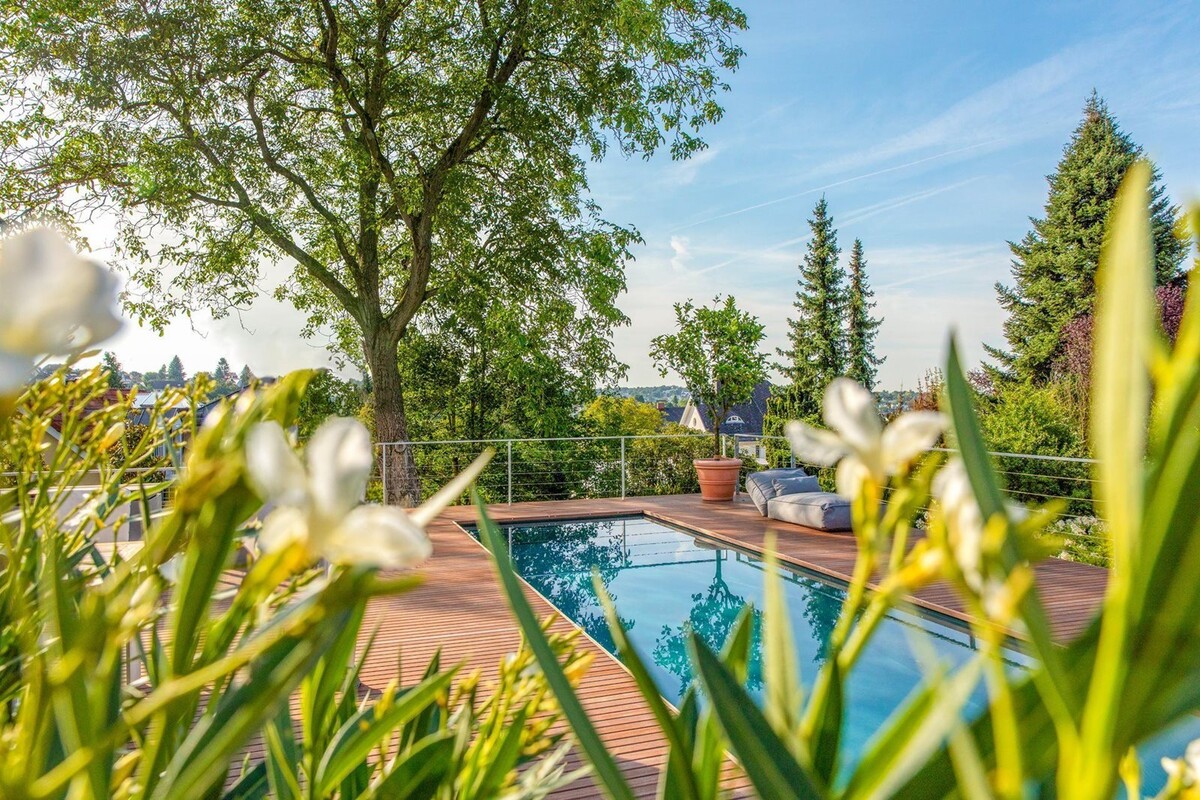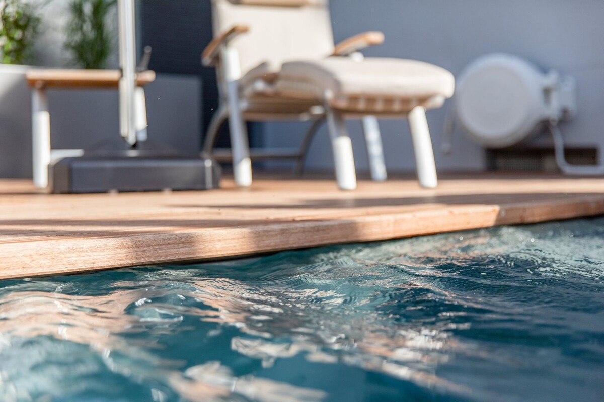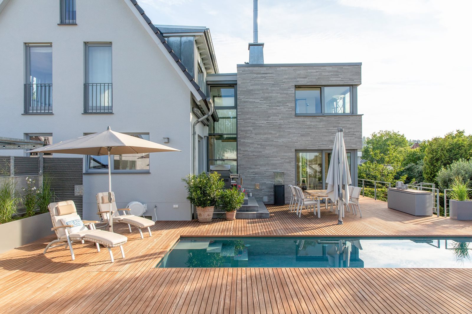 The wooden terrace around the pool offers plenty of space for the children to enjoy the water, as well as for evening social get-togethers with friends. As the Underflow overflow edge is hidden beneath the terrace, this is the ideal model for saving water as you swim, while still offering a unique overflow design.